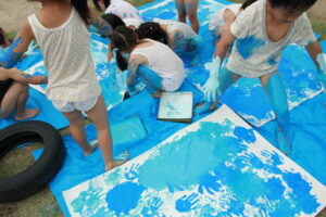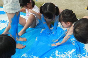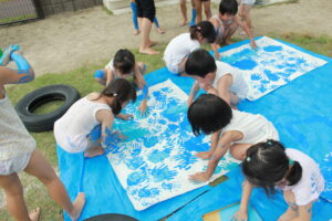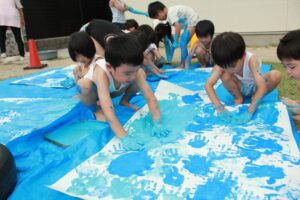 絵具の感触を楽しみながら、夢中になって模造紙を染めていきます。