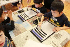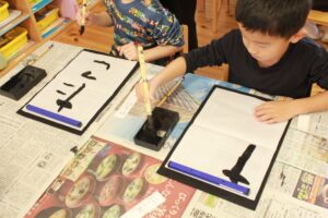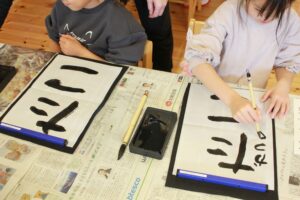 筆の持ち方、墨の付け方、筆の運び方を教わって、初めてのお習字を楽しみました。