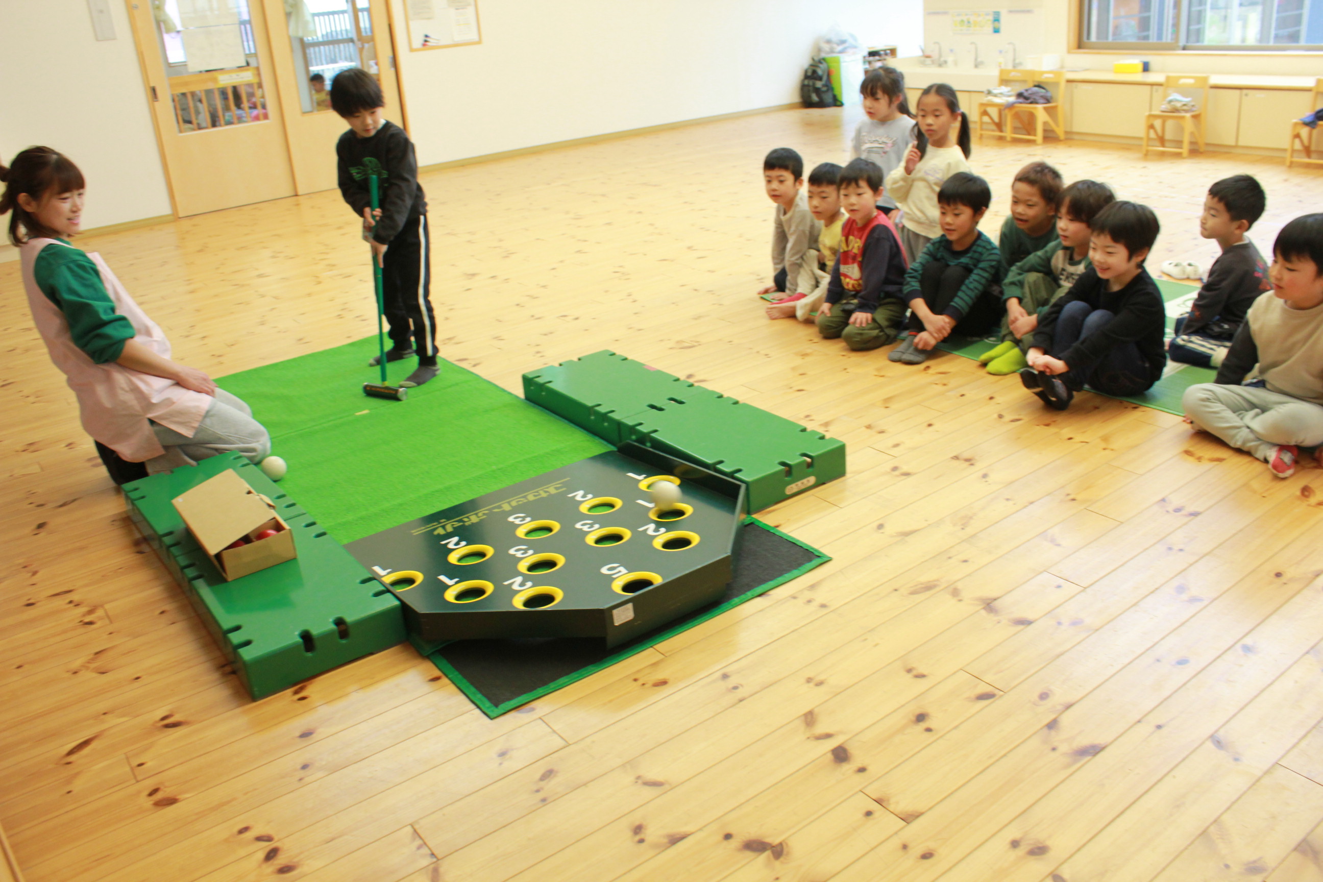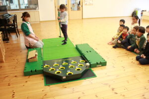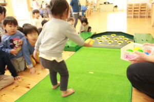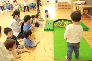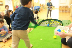 はな組は、やわらかいボールを転がして挑戦。