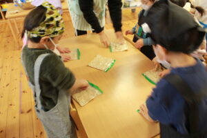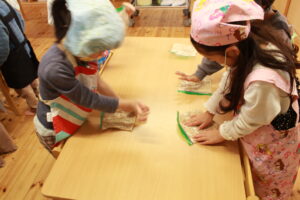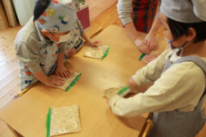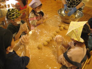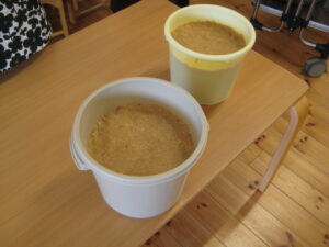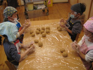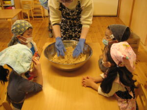 2026年2月18日食育園ブログ 味噌作り(つき) 2月13日、恒例となった「味噌作り」を、つき組と一緒に行いました。 前日から水で戻した大豆を柔らかく茹で、潰します。 塩と麹と種味噌を合わせたものに、潰した大豆を混ぜ 今度は味噌玉にします。 味噌玉が出来たら、樽へと入れていきます。 しっかり空気を抜いて、重しを置いたら、後は冷暗所で発酵させます。 出来上がるのは今年の秋頃。今から楽しみですね^^ 前の記事へ一覧へ戻る