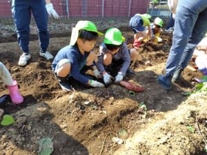 2025年10月30日食育給食 芋ほり 春に植えたさつまいもを収穫しました! 今年はさつまいもが不作…というニュースを耳にして心配でしたが 大きなお芋がたくさん収穫出来ました☆ 採れたお芋を使ってクッキングも行います。楽しみですね! 前の記事へ一覧へ戻る
